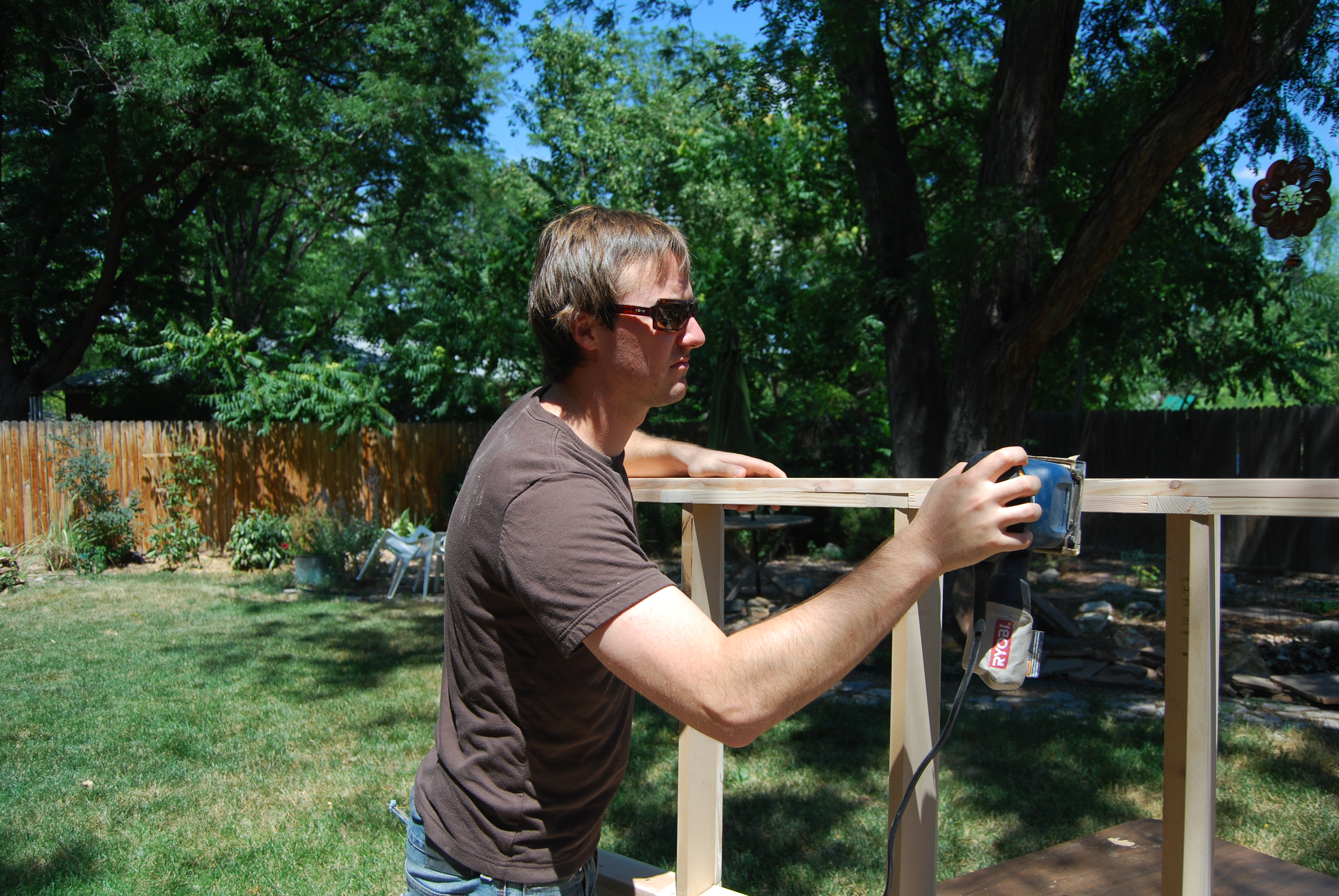 That’s my man, building some shelves.  He doesn’t look very happy, but you wouldn’t be either if you had sawdust flying in your face.  Okaaaaaaaaay?
