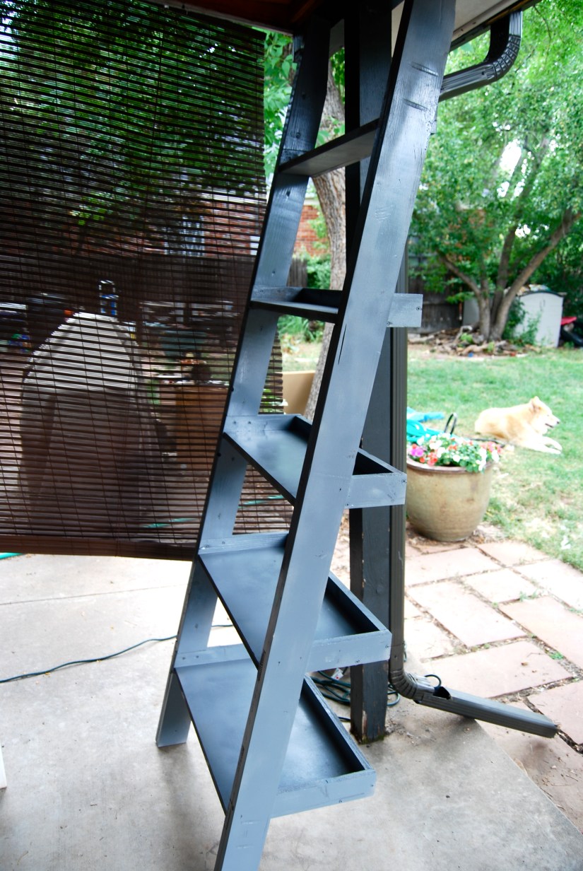 These are the ladder-style bookshelves my man built, before I attacked them with spray paint.
