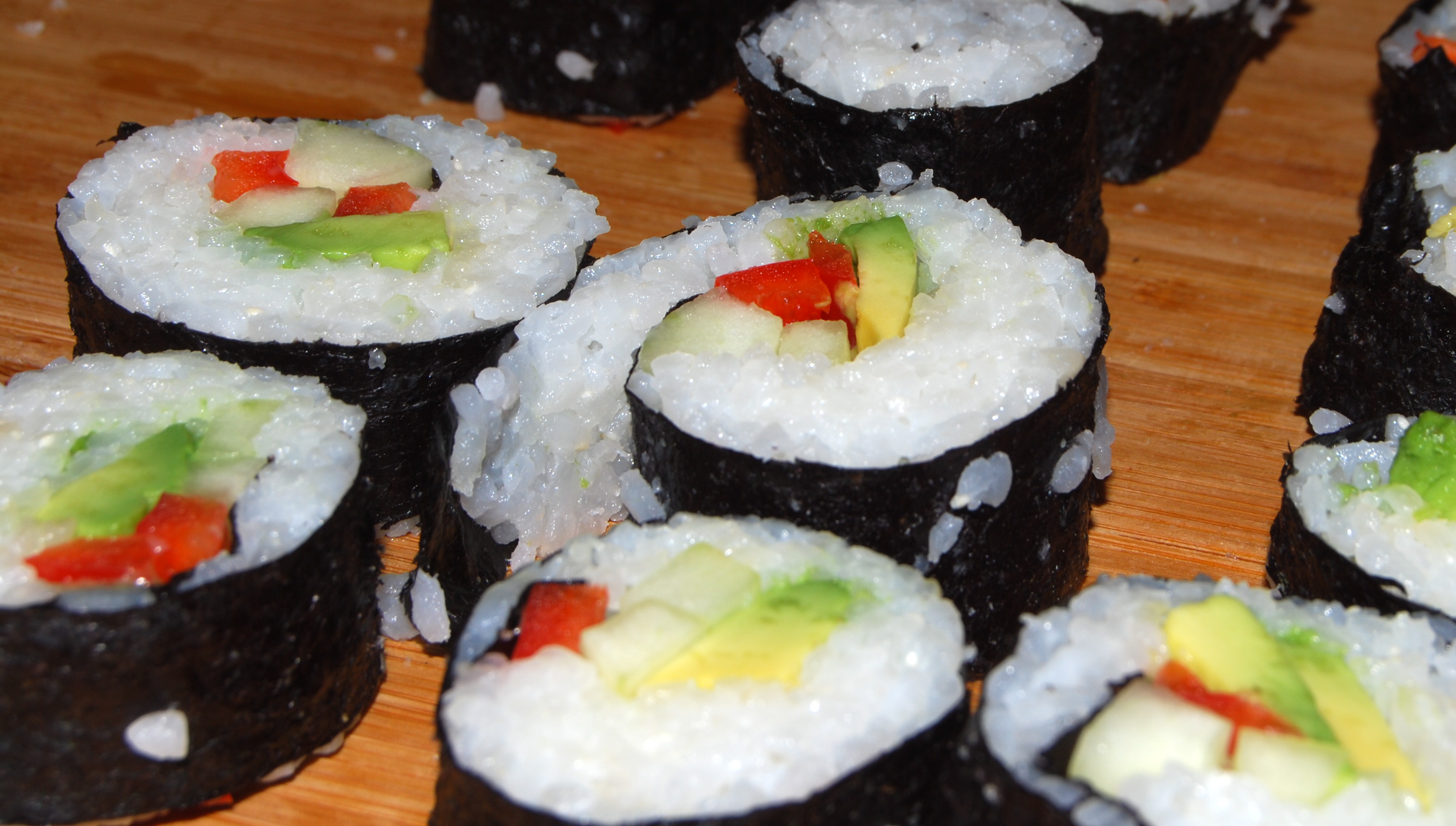 Now move the piece of nori onto a rolling mat.  Take one long, cut-piece each of avocado, red bell pepper and cucumber (often you need two avocado slices, due to their naturally diminutive stature) and lay them together on top of the rice.  Now comes the fun part!  (Haven’t you been waiting for this the WHOLE TIME??)