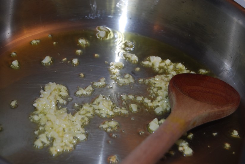Throw the garlic on a fancy silver pan of warmed olive oil (medium heat is fine for now, and will be for the duration, unless you get too liquidy), wait until it smells so good that you want to stop cooking and just eat the garlic alone, and then throw the shallots in to protect it from your monstrous craving.