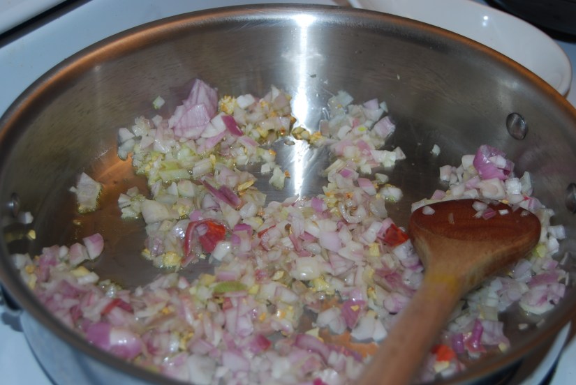 It’s time to be the mayor of chop city, people.  Go to work with a sharp knife and get the garlic, shallots, leeks and mushrooms pretty dang small (you can just slice the mushrooms, and the shallots and leeks can just be a rough dice).  Pour the broth into a large boiling pot, and leave it on low heat on a separate burner.