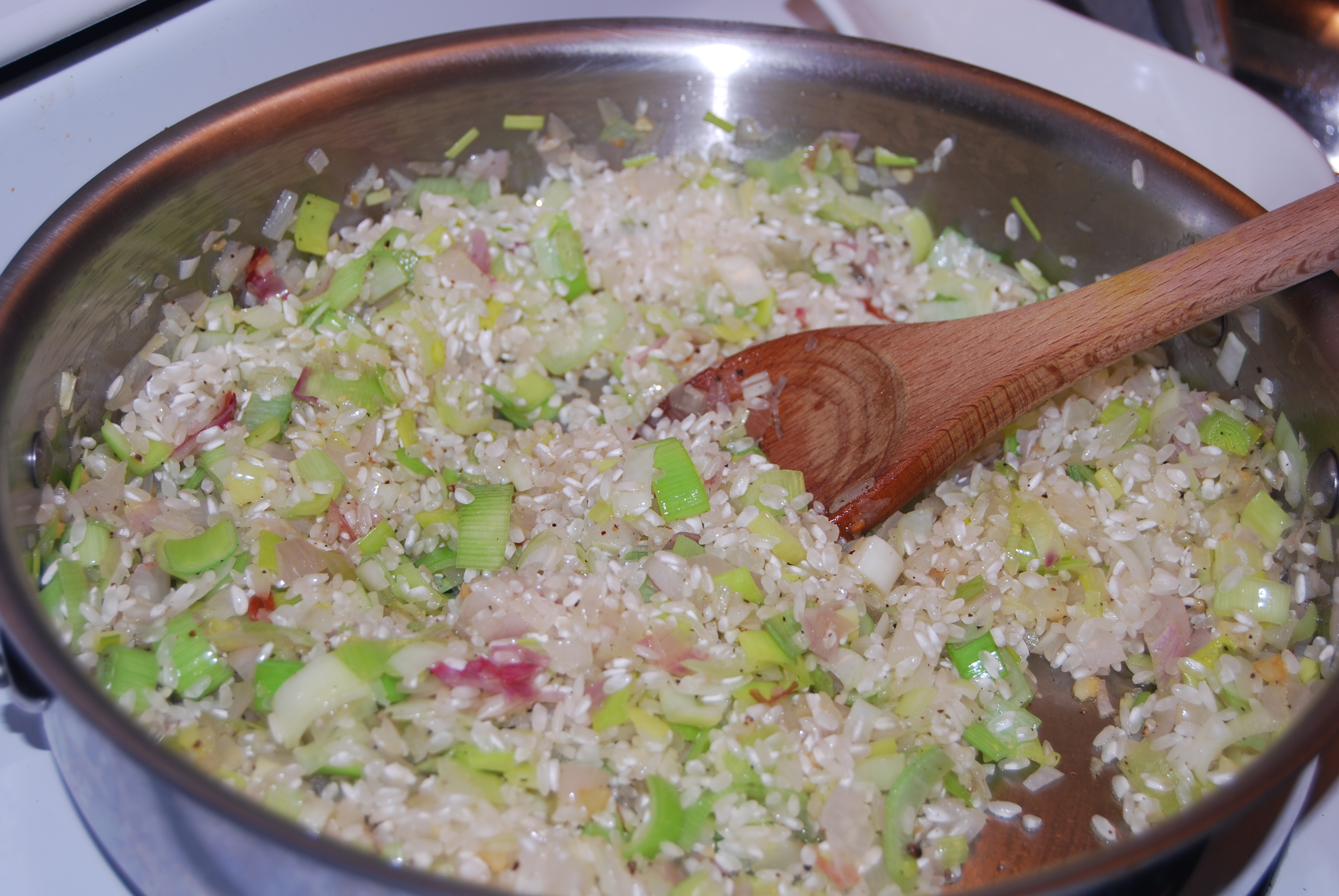 Now, throw in that dry arborio.  Stir it around for two or three minutes, and let it make a fashionably late guest entrance to the color and flavor party that you are hosting in your fancy silver pan.  Just look at that pan.