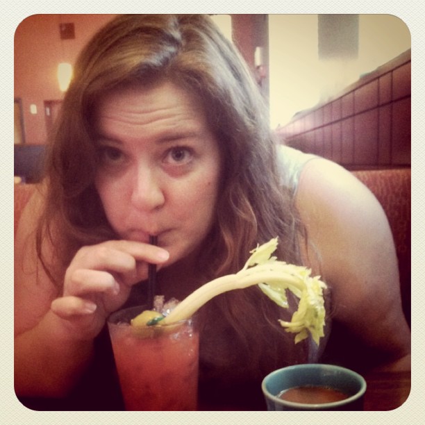 [A fitting variety of beverages for my Birthday Brunch…”salad” (a bloody mary) and “sustenance” (coffee in turquoise Fiestaware!!! I may or may not have bought that mug for myself as a birthday present. To myself. OKAY I bought two. Never mind.)]