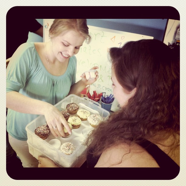 [Getting to pass out my cupcakes in “school”!!!!!!!!!!!!! I am smiling very big, in case you can’t tell. Also, that’s my girl Tatiana. She’s awesome.]