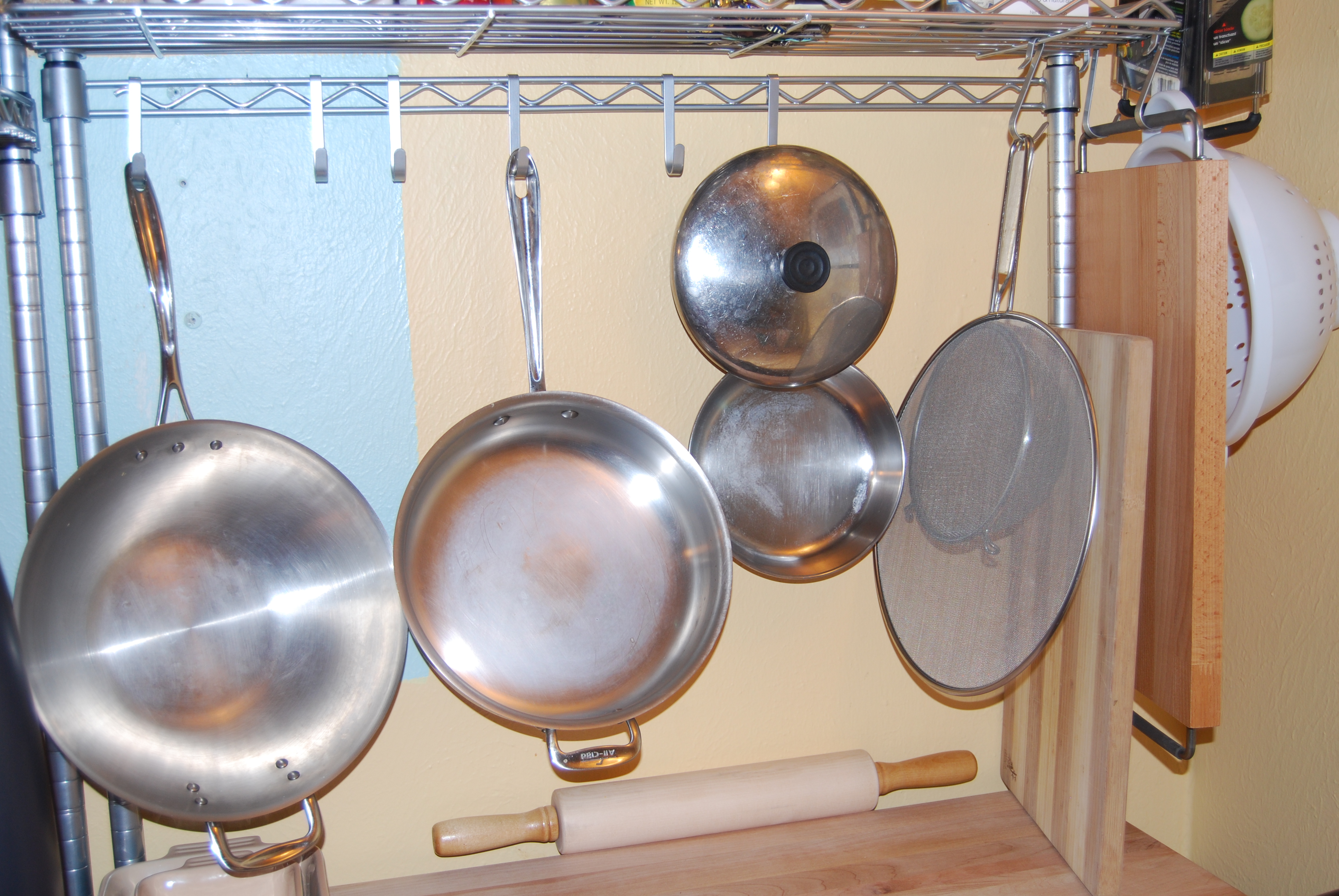 We have amassed quite a collection of pots and pans, and it’s really fun to have them on display.  Also, look at my rolling pin!  It’s never been used.  Ssssshhh.