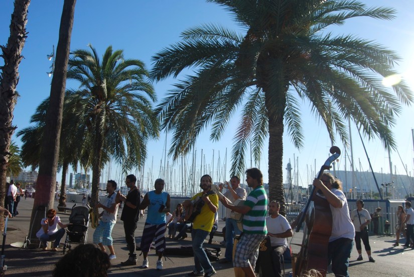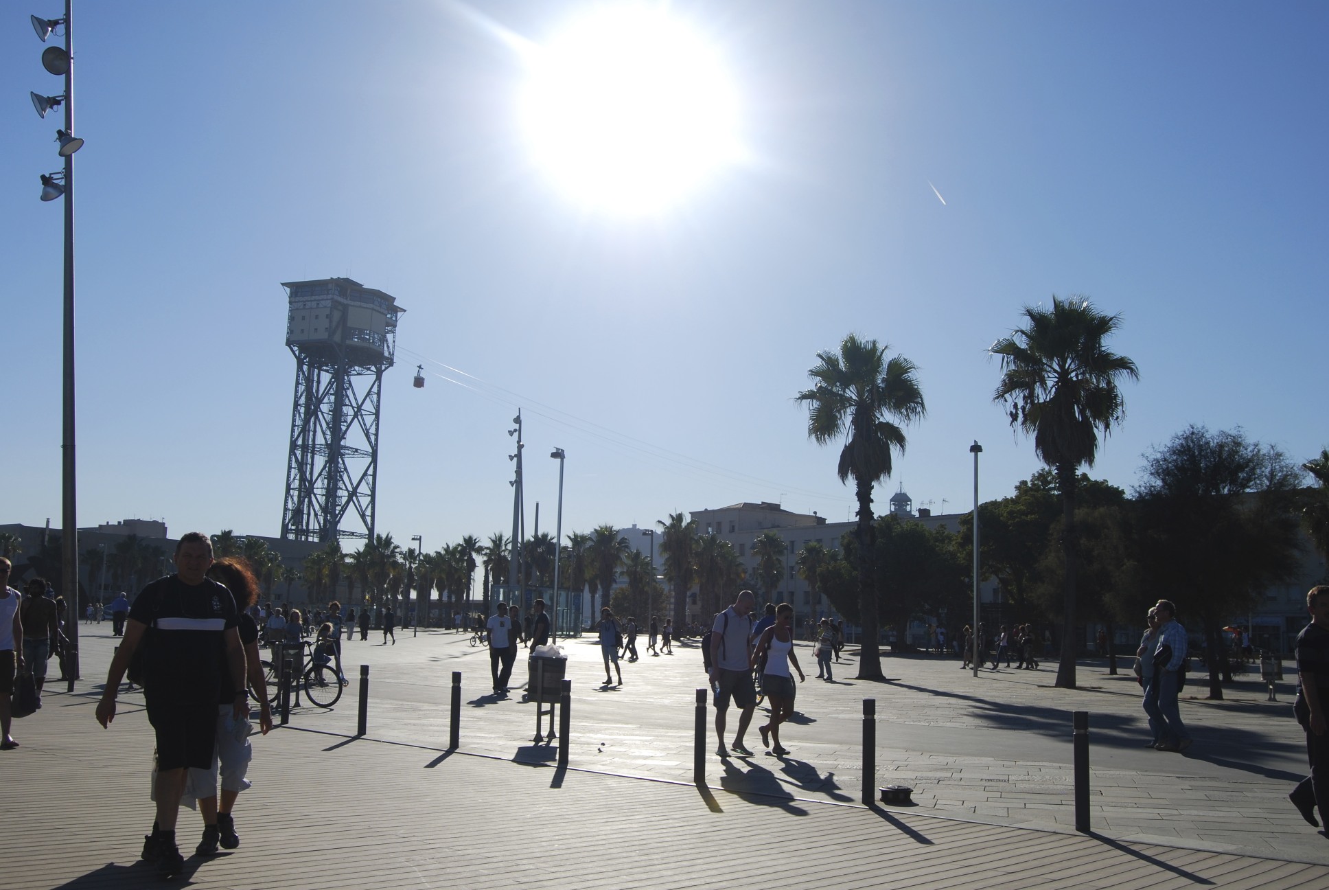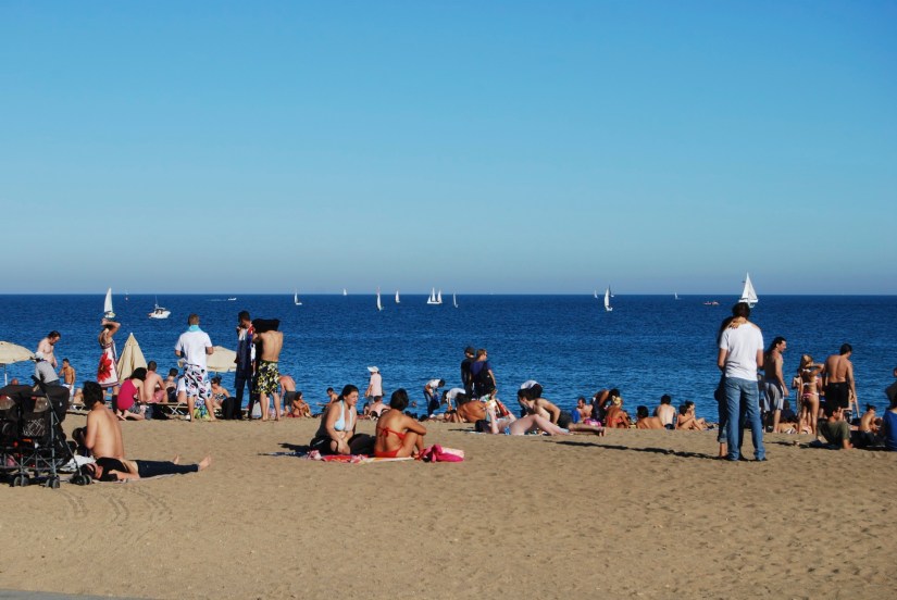 [Barceloneta beach – please note the giant copper fish in the background.  It gets CRAZY glinty all over the place when the sun reflects off of it.  Also, it’s a giant fish.]