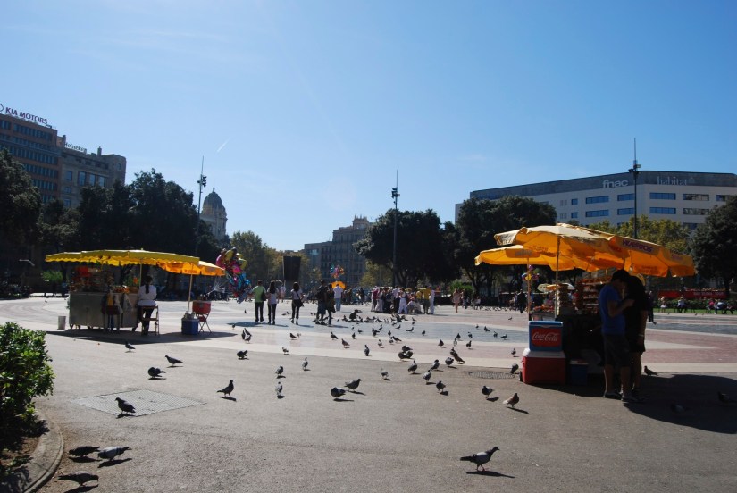 [Plaza Catalunya – pigeons, bums, street-dancers, you name it.]