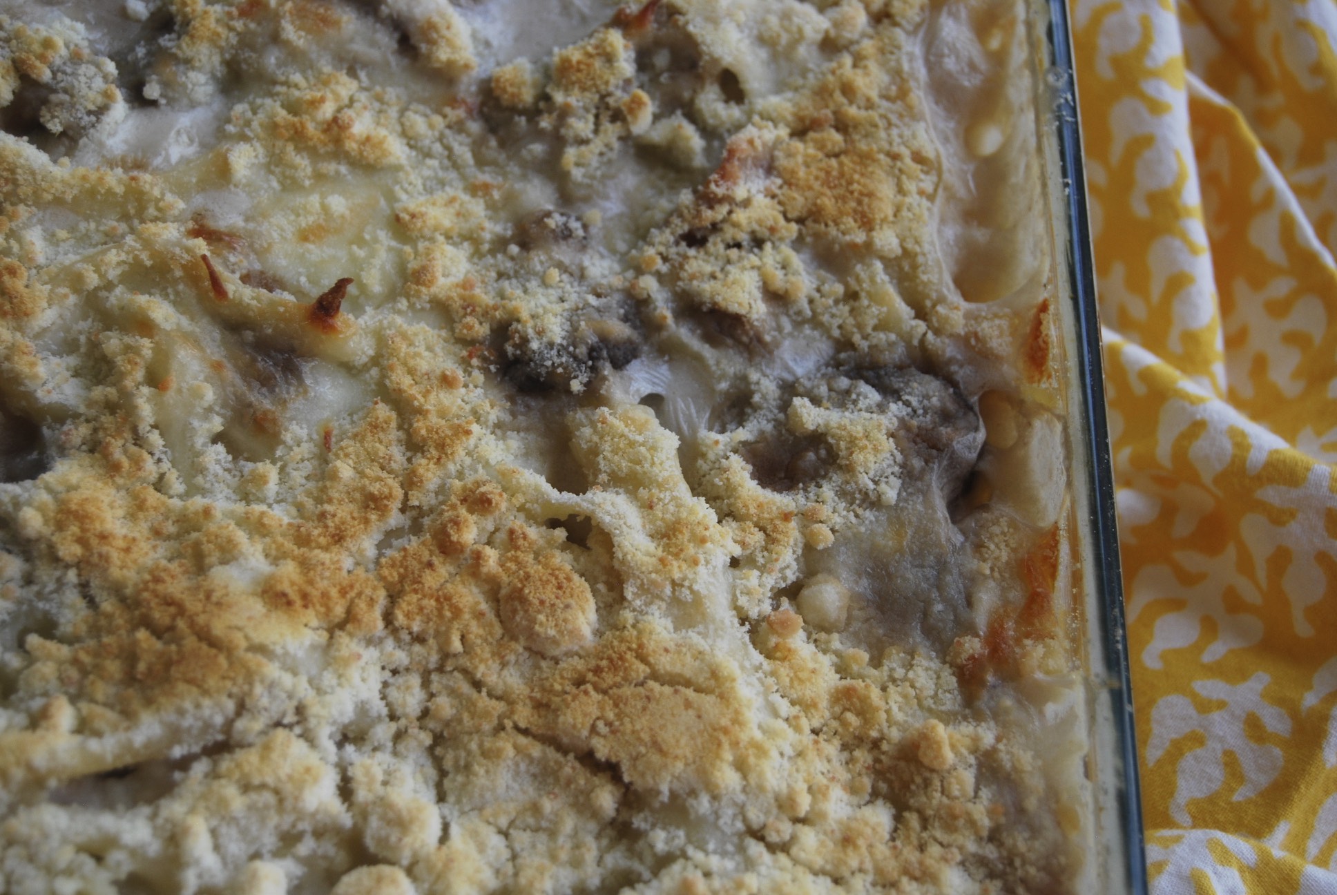 Here’s the deal: tetrazzini is mega super easy. For real. You can use chicken or turkey, and you can play around with the kind of noodles you like in it as well. Here’s another bonus: once this cools and firms up, you can cut it up, wrap it in saran wrap, and throw those suckers in the freezer for some other time when you want tetrazzini.