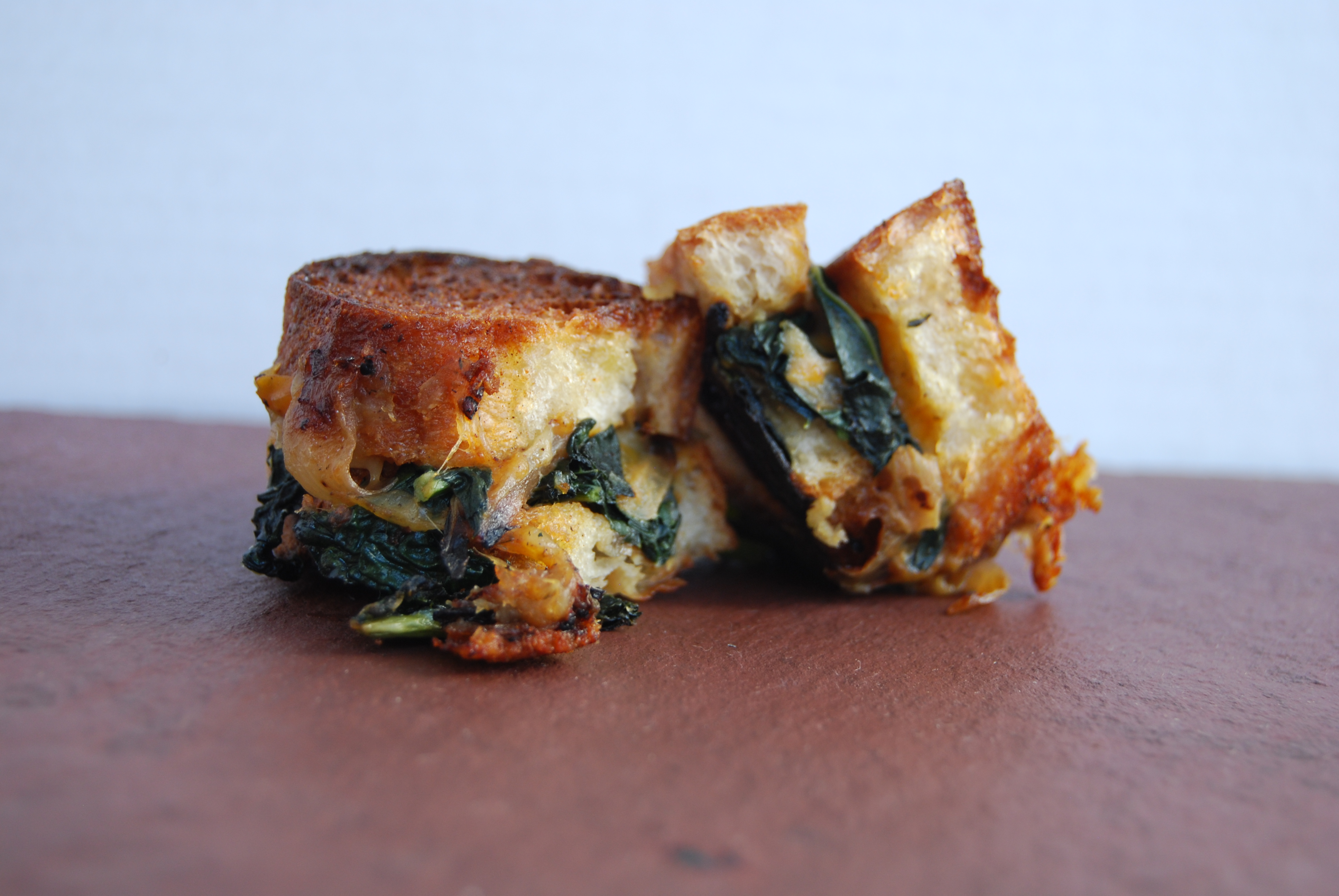 - Place bread in the hot pan and sprinkle cheese over each slice of bread. After 2-3 minutes, add kale and onion mixture and place 2 of the 4 pieces of bread on top of the other 2 pieces to form sandwiches.