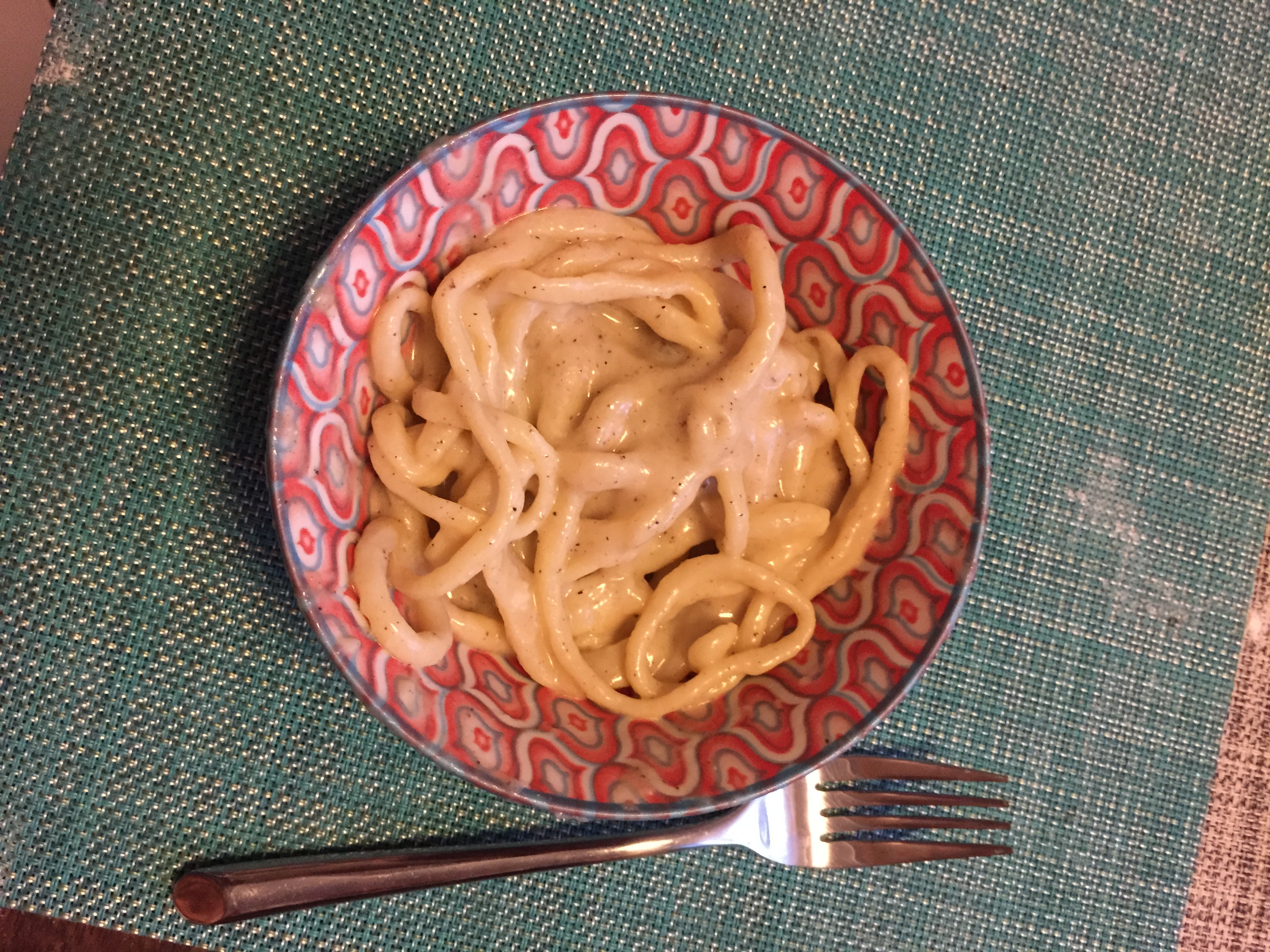 It turns out that combining these two recipes ends up getting to be just a little bit time-sensitive, since fresh pasta doesn’t need to cook for very long, and the cacio e pepe sauce requires that pasta water as its base ingredient. So. This requires some paying of attentions!